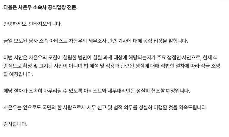 Cabe señalar que Cha Eun Woo no ha emitido declaraciones personales, ya que actualmente se encuentra cumpliendo con su servicio militar obligatorio. Toda la información disponible ha sido comunicada exclusivamente a través de su agencia.