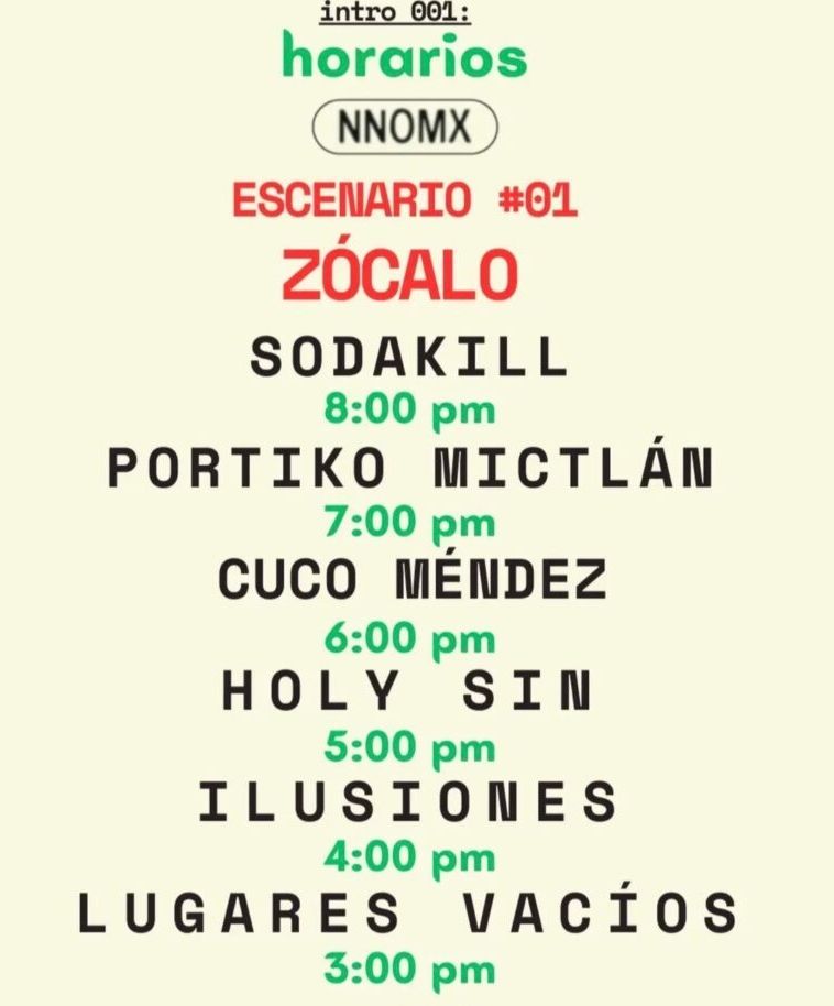 De acuerdo con los organizadores, las actividades iniciarán durante la tarde. En el Escenario #1 del Zócalo, la programación comenzará a las 15:00 horas con Lugares Vacíos, seguido por Ilusiones a las 16:00 horas, Holy Sin a las 17:00 horas, Cuco Méndez a las 18:00 horas, Portiko Mictlán a las 19:00 horas y Sodakill a las 20:00 horas.