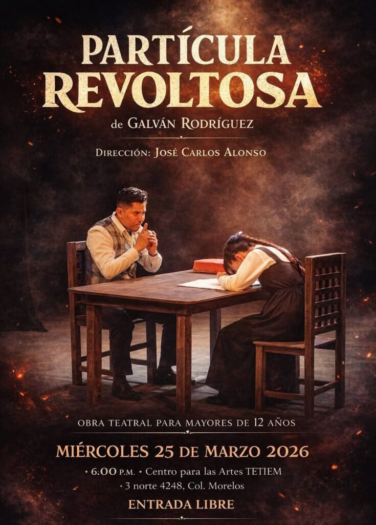 El miércoles 25 de marzo a las 18 horas y con entrada libre también, será el estreno de “Partícula revoltosa” escrita por Felipe Galván Rodríguez: “¿Qué influencia tienen en nuestra vida las maestras y maestros? ¿Qué tan significativa puede llegar a ser la relación maestro-alumno? ¿Cuántas veces escuchamos a nuestros maestros decir que no llegaríamos a ningún lado con nuestra actitud? Partícula revoltosa se centra e inspira en un período específico en la vida de la escritora Elena Garro, en medio de la guerra cristera, en el paso de la infancia a la adolescencia, entre la rebeldía y la curiosidad, el desdén por las matemáticas y el humanismo de la joven Elena. Es una obra para adolescentes, jóvenes y adultos, para escuchar y reflexionar sobre nuestra relación con los modelos con que somos enseñados y que aprendimos durante nuestra infancia-adolescencia, qué podemos enseñar y qué legado dejaremos a los niños y jóvenes que nos rodean en casa, en la familia y en nuestra comunidad”.