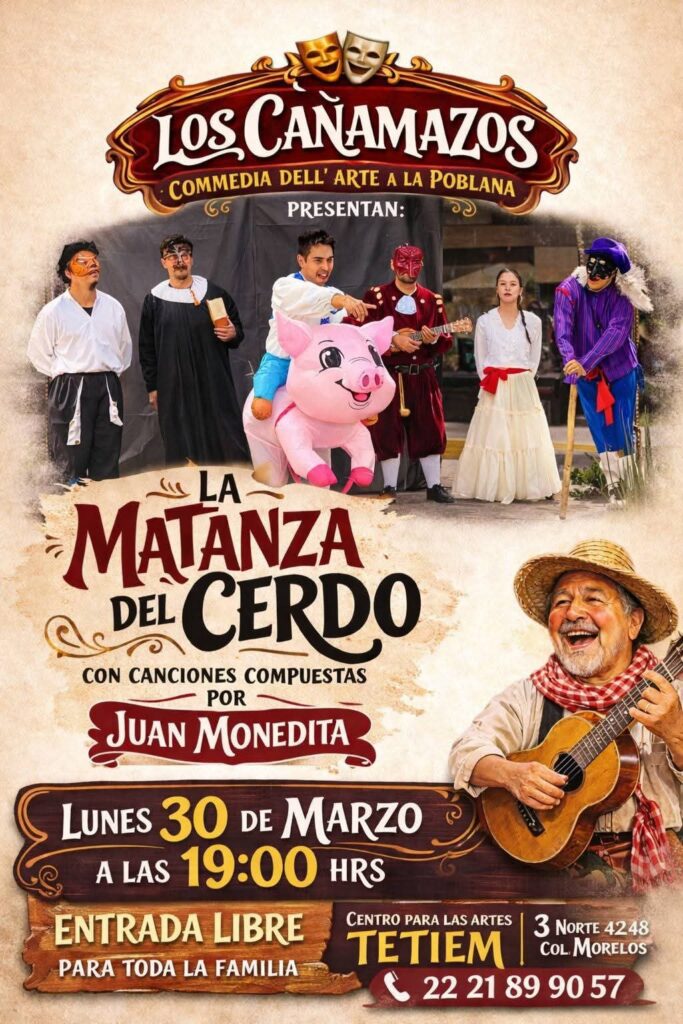 Finalmente, será presentada “La matanza del cerdo” a cargo de la compañía de commedia del’arte los cañamazos, resultado del taller de commedia del’arte impartido por el maestro Fernando Medel Rosas en el Centro para las Artes TETIEM: “Esta es una puesta en escena divertida con personajes característicos como el avaro Pantalone, el sabihondo Dottore, el pretensioso Capitanno y sus sirvientes que provocan enredos y situaciones inesperadas, con canciones escritas por Juan Morales, ‘Juan Monedita’. La presentación será el lunes 30 de marzo a las 8:00 pm con entrada libre, para toda la familia”.