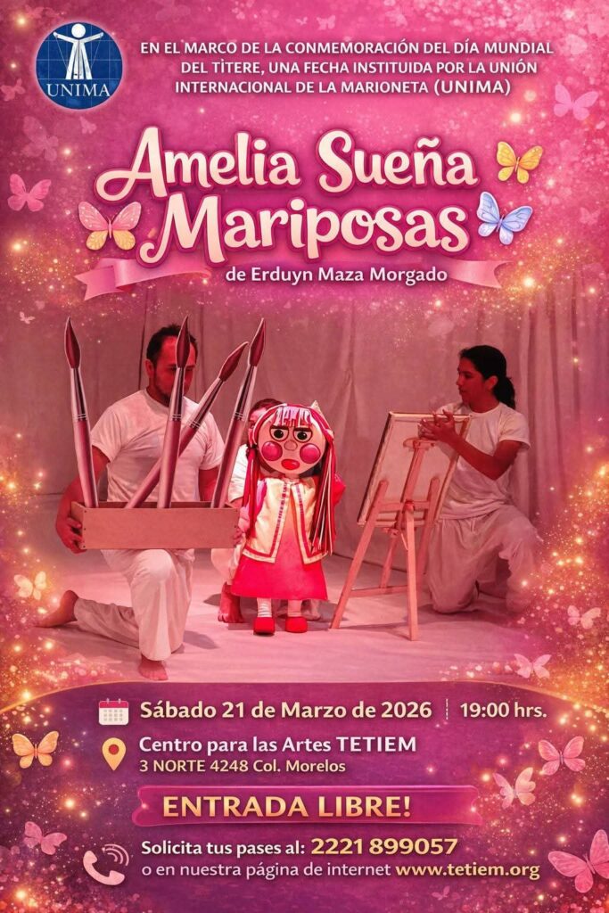 Este sábado 21 de marzo, tendrán la obra “Amelia sueña mariposas”: “Una niña con un poder extraño y particular, todo lo que dibuja se hace realidad y provoca el interés y codicia de un malvado legislador que quiere poder para él. ¿Puede la valentía de una sola niña traer la libertad a todo un pueblo? Amelia sueña mariposas, puesta en escena con títeres para toda la familia, especialmente niñas y niños, realizada en colaboración con Teatro la Proa de Cuba, la cual cierra su ciclo y tendrá una última presentación el sábado 21 de marzo a las 7:00 pm en el centro para las artes TETIEM, una obra de títeres divertida, con mucha acción y canciones memorables. Entrada libre”.