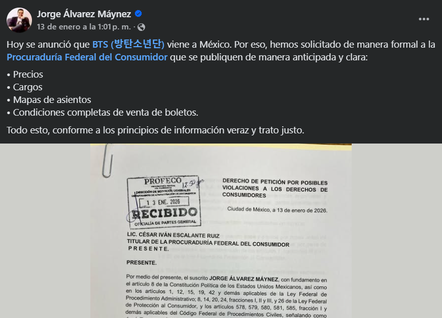 A través de sus redes sociales, el político anunció que su partido ha “solicitado de manera formal a la Procuraduría Federal del Consumidor que se publiquen de manera anticipada y clara, precios, cargos, mapas de asientos y condiciones completas de venta de boletos”.